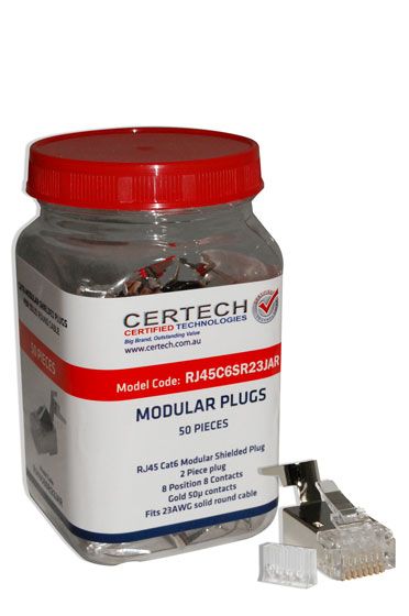 - CERTECH Cat6 RJ45 23AWG Plug 50pc Jar, Round Solid Shielded
