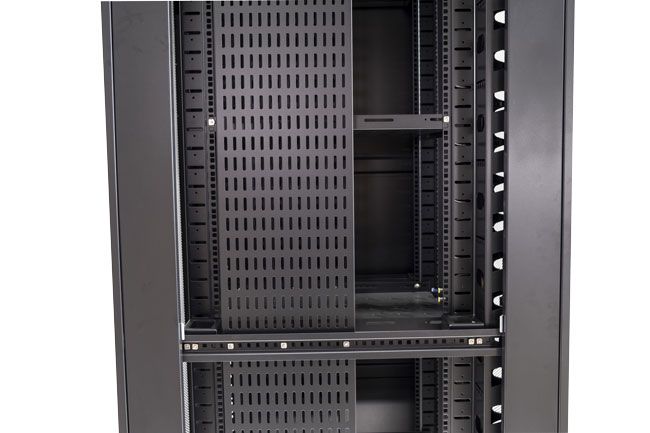 Perforated front and rear doors provide ventilation for servers and networking equipment. Both doors being split, reduces the need to have 800mm of space to open the door completely.