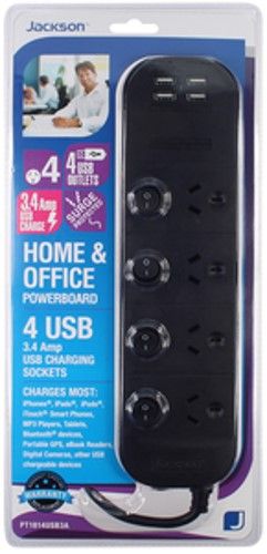 - Jackson 4 Outlet Surge & Overload Protected Individually Switched Powerboard with USB Charging Ports