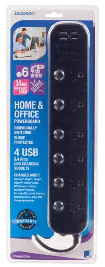- Jackson 6 Outlet Surge & Overload Protected Powerboard with USB Charging Ports
