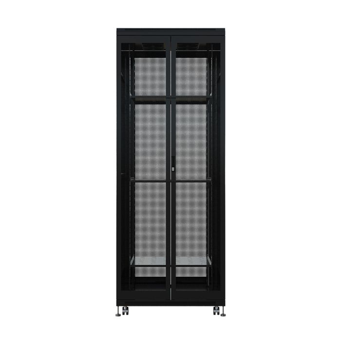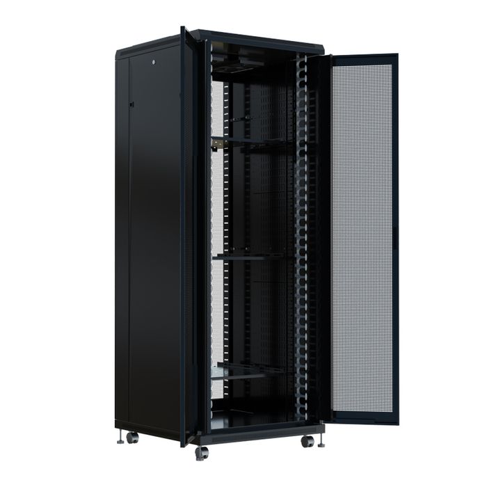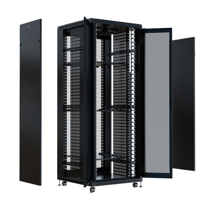 Perforated front and rear doors provide ventilation for servers and networking equipment. Both doors being split, reduces the need to have 800mm of space to open the door completely.