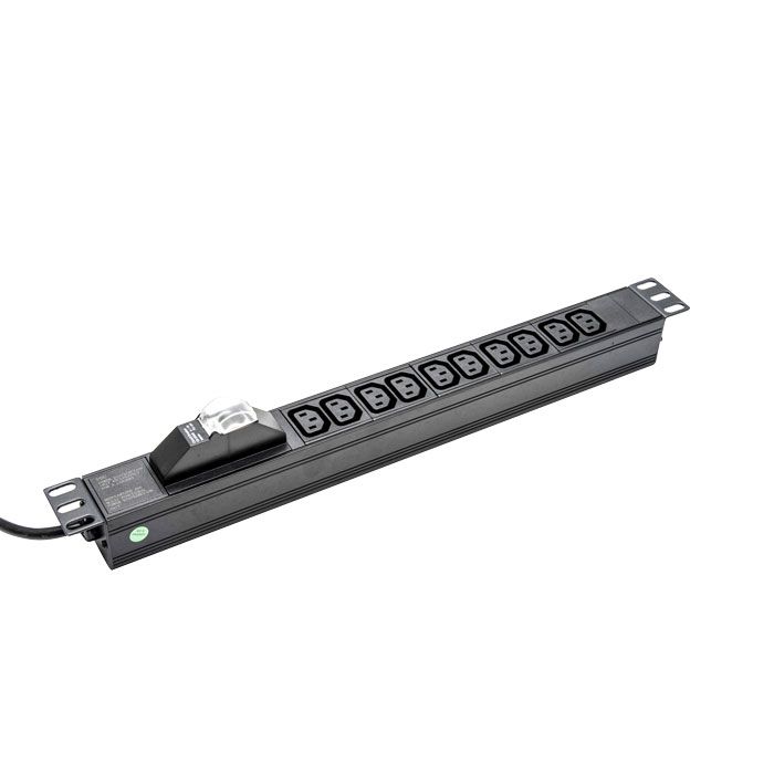 CERTECH Power Rail - Horizontal 10 Position 10A, IEC (IEC320- C13) Outlets. Size:19", 1RU, 68mm Deep. 3m IEC C14 Power cord, Circuit Breaker overload reset switch. Black Colour