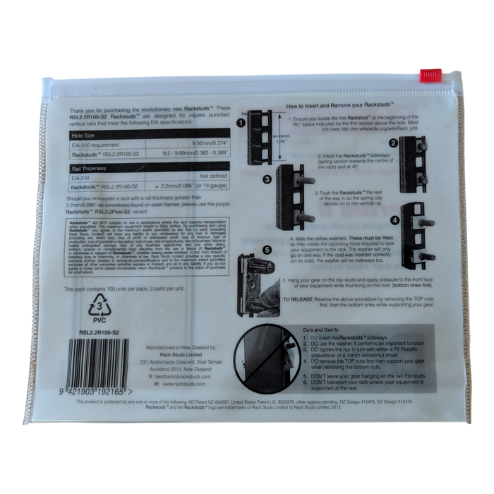 Say goodbye to cage nuts and hello to the faster, easier way to mount your equipment in 19" racks. The revolutionary new Series II Rackstuds are a universal replacement for the common cage nut. If you use cage nuts to mount IT, Pro A/V, Security or Telecommunications equipment in 19" racks, you're going to love Rackstuds. Suitable for most* 19" racks with square punched vertical rails, Rackstuds go in from the front and provide you with a place to hang your equipment while spinning on the lock nut. This makes mounting even heavy equipment much easier; even if you're on your own. They are easier, faster and safer than cage nuts and very strong.