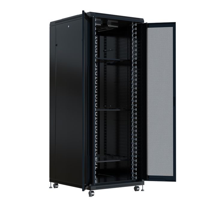 Perforated front and rear doors provide ventilation for servers and networking equipment. Both doors being split, reduces the need to have 800mm of space to open the door completely.