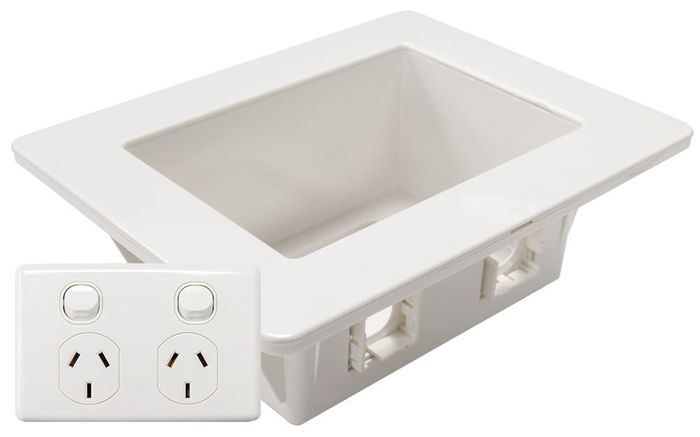 CERTECH's Recessed Wall Box with 2x Australian style outlets. Includes 2 ports switched GPO. Suitable for 70 & 90mm wall cavities. For plaster walls only. Outside face: 185 x 145mm. Recess: 166 x 100mm. Depth: 63mm.