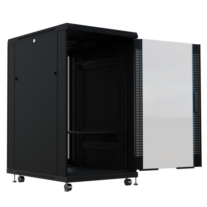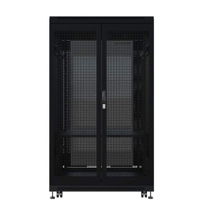 Perforated rear doors provide ventilation for servers and networking equipment. Both doors being split, reduces the need to have 800mm of space to open the door completely.