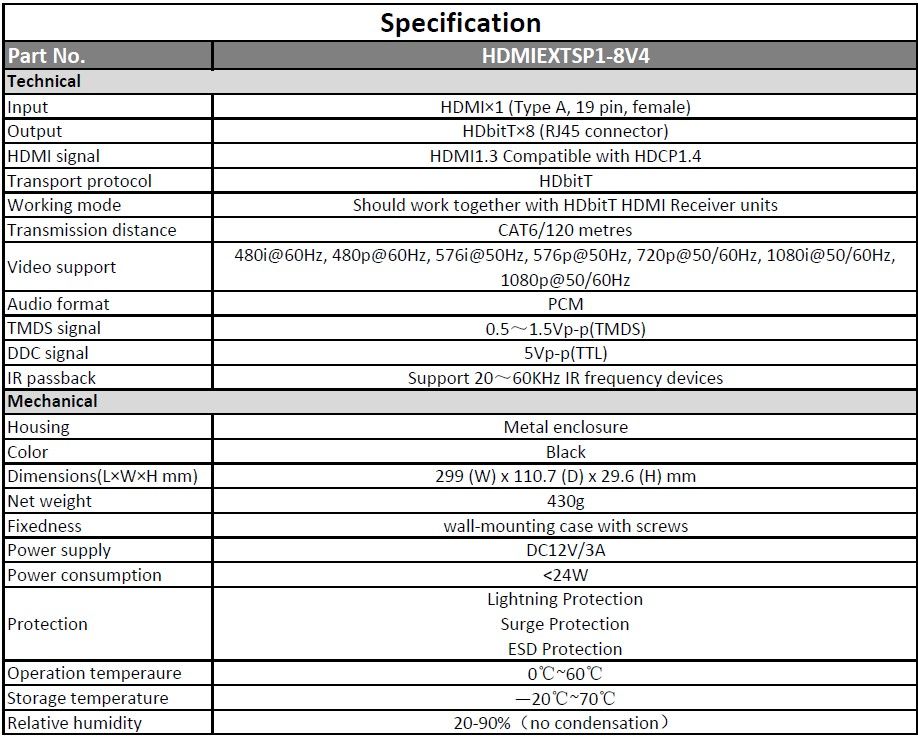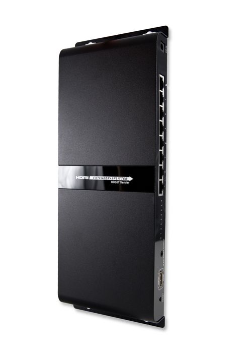 The HDMIEXTSP1-4V4 combines the extender & splitter function to split 1 HDMI signal to 8 identical signals via network cable and it is used as a sender to work with 8 receivers to transmit these 8 HDMI signals up to 120 metres.