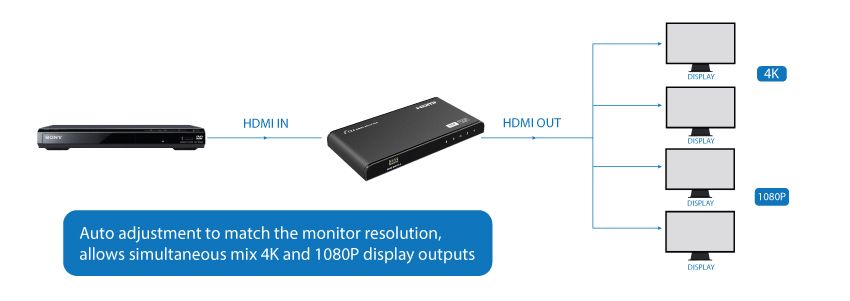 1. Distribute 1 HDMI source to 4 HDMI displays