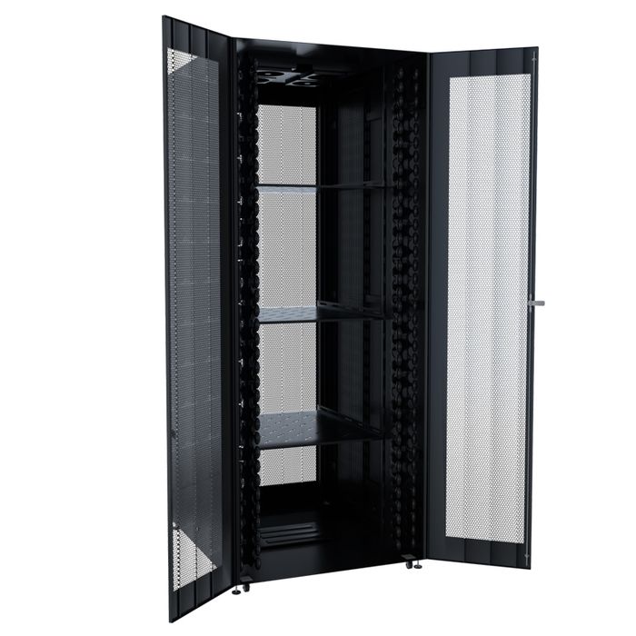Perforated front and rear doors provide ventilation for servers and networking equipment. Both doors being split, reduces the need to have 800mm of space to open the door completely.