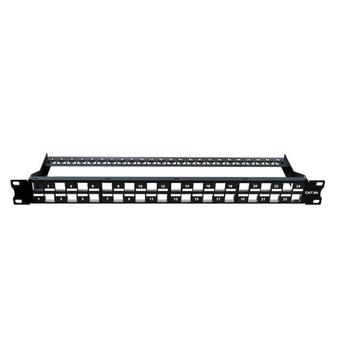 CERTECH 1RU 19" 24 Port Unloaded UTP Patch Panel with staggered outlet design to improve AXT performance, inlcudes snap in Rear Support Bar.