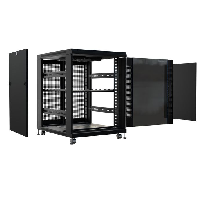 Inclusions:4 x fans, 1 x shelf, 25 x cage nuts, 1 x horizontal 6 outlet PDU, 4 x castor wheels & levelling feet