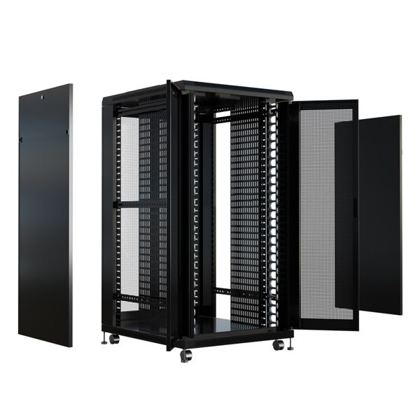 - Supplied with dual vertical cable ducts, 4 x fans, 1 x fixed shelf, 1 x 6-outlet 10A horizontal PDU, cage nuts, castor wheels & levelling feet
