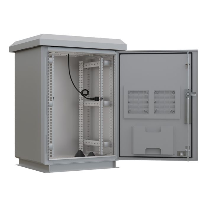 The cabinet design allows natural wind cooling through filtered vents on the front door and venting under the lip of the rain hood, which has a 25mm vented lip and is angled at 75mm, allowing for water run-off. The filters are conveniently located on the front door, allowing for easy access & servicing, without having to remove any rack-mounted equipment. - Front Door