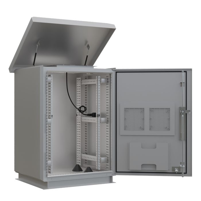 Smartly designed, fans (with dust filters) are accessible by lifting the pivoting rain hood, allowing the fans to be serviced without having to remove any rack-mounted equipment. Comes with a thermostat for controlled air flow. - Cable Entry